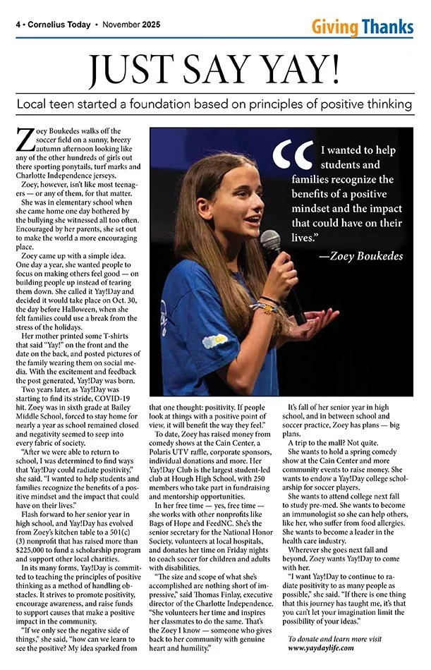 By official proclamation and presentation of the Town of Cornelius Mayor’s Coin, honorable Mayor Woody Washam declared October 30th to be “Yay!” Day and “Zoey Boukedes Day” in the city of Cornelius at a surprise ceremony prior to the start of our Yay!DAY’s 2025 Comedy Night at The Cain Center for the Arts.